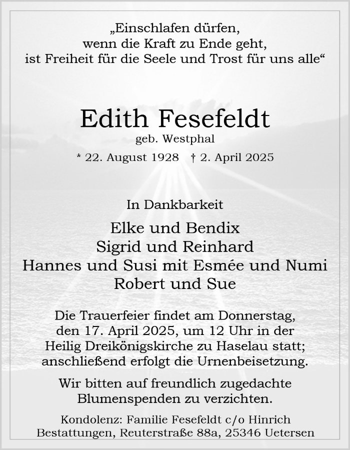 wir wünschen Ihnen von Herzen viel Kraft, dass Sie Menschen um sich haben, die Ihnen in dieser schweren Zeit beistehen und Halt geben. Zusätzlich können Sie auf dieser Gedenkseite Erinnerungen teilen und so das Andenken gemeinsam wachhalten.