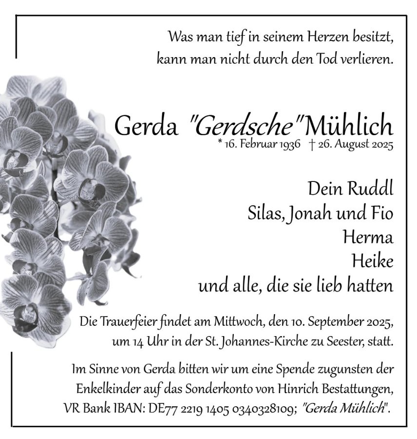 wir wünschen dir und deiner Familie in dieser schweren Zeit ganz viel Kraft und können die Traurigkeit in euch von ganzem Herzen mitfühlen! Wir werden Gerda in liebevoller Erinnerung behalten, denn liebe Menschen vergisst man nicht!