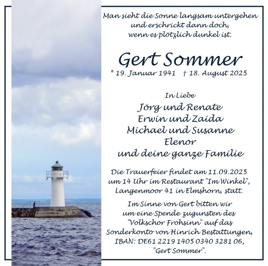 in dieser Zeit des Schmerzes wünschen wir Ihnen Kraft, den Verlust im Kreise Ihrer Liebsten zu verarbeiten. Als Zeichen unserer Anteilnahme und des Gedenkens entzünden wir dieses erste Licht. Möge diese Gedenkseite Ihnen helfen, Erinnerungen zu teilen und so das Andenken gemeinsam wachzuhalten.