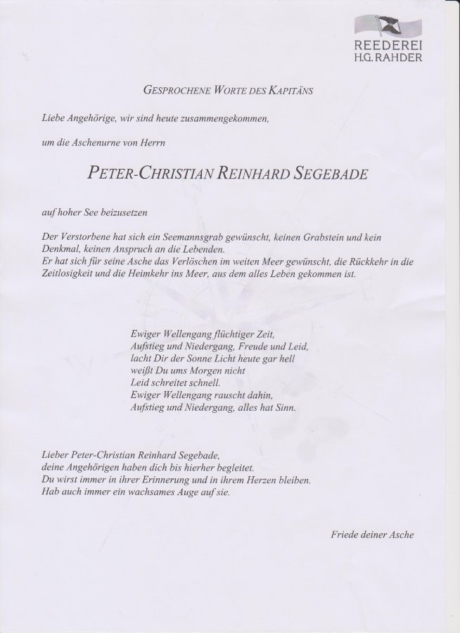 Stunden habe ich am Ufer der Nordsee gesessen und an die vielen wunderbaren gemeinsamen Erlebnisse gedacht - was hatten wir für ein schönes Leben zusammen! Nun bist du auf dem Weg zu den Stränden unserer Freunde in der weiten Welt, damit auch sie dir eine Rose zuwerfen können. Ich vermisse dich!